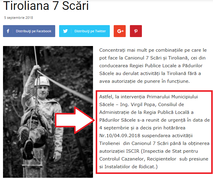 Închiderea tirolianei s-a produs prin decizia Consiliului de Administraţie nr. 10 din 4 septembrie 2018, dar autorul moral este primarul Virgil Popa.
