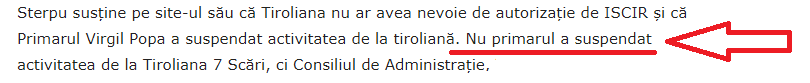 Chestionat de opoziţie, prin vocea consilierului Ciprian Sterpu, şi suspectat de cunoscătorii legislaţiei de un abuz în funcţie, primarul răspunde prin vocea subalternilor săi în aceeaşi publicaţie online a PSD Săcele unde se spune ca “NU primarul a suspendat activitatea tirolianei, ci Consiliul de Administraţie”.