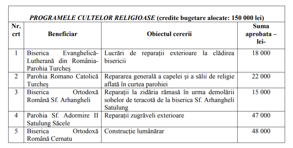 În urma finalizării procedurii de selecție și evaluare, autoritatea finanțatoare Municipiul Săcele a anunțat lista beneficiarilor de finanțare nerambursabilă alocată de la bugetul local al Municipiului Săcele pentru acțiuni și investitii în zona cultelor religioase pe anul 2019, în ordinea punctajelor obținute și în funcție de creditele bugetare aprobate.