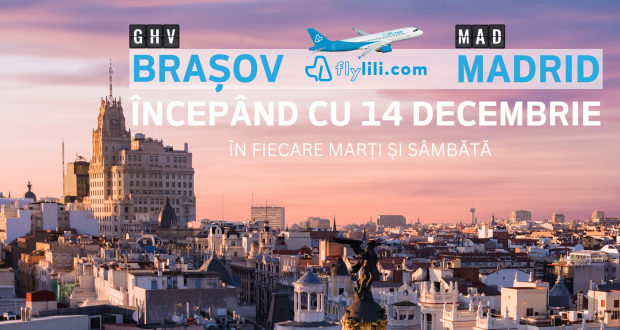 🇪🇸 Partenerul nostru de zbor, FLY LILI, va conecta Brașovul și centrul României – cu capitala Spaniei, de 2 ori pe săptămână, în fiecare zi de marți și sâmbătă.