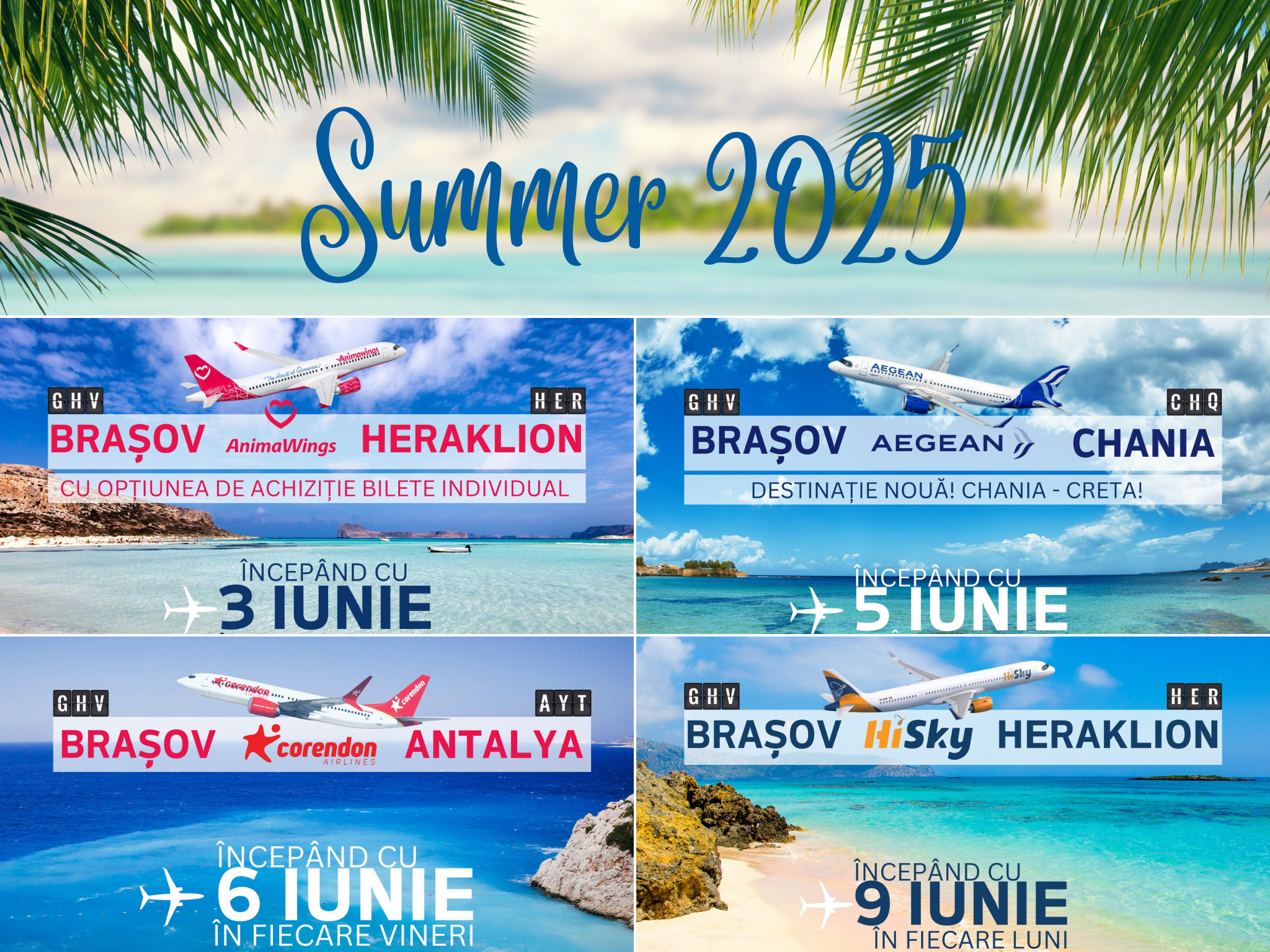 Este cel de-al cincelea charter anunțat pentru vara 2025, ce va transporta turiștii direct de la Brașov spre destinațiile calde de vacanță: 3 catre Creta, 1 catre Antalya si 1 catre Rhodos