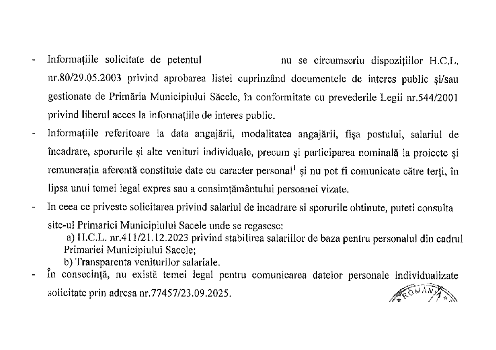 Surpriza însă! Primaria Sacele, cea condusa dictatorial de Popa Virgil de la PSD, face scut in jurul politrucului Lungu si refuza sa ofere aceste informatii … sub pretextul ca sunt informatii personale, ce nu sunt prinse in lista de documente ce pot fi transmise. (foto jos)