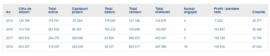 Daca in 2016, cifra de afaceri era de 313.758 lei si fusese obtinuta cu 4 angajati (conform https://www.infoquick.ro/ foto jos), un an mai tarziu, in 2017, cifra de afaceri crestea la 660.835 lei si era obtinuta cu 10 angajati.