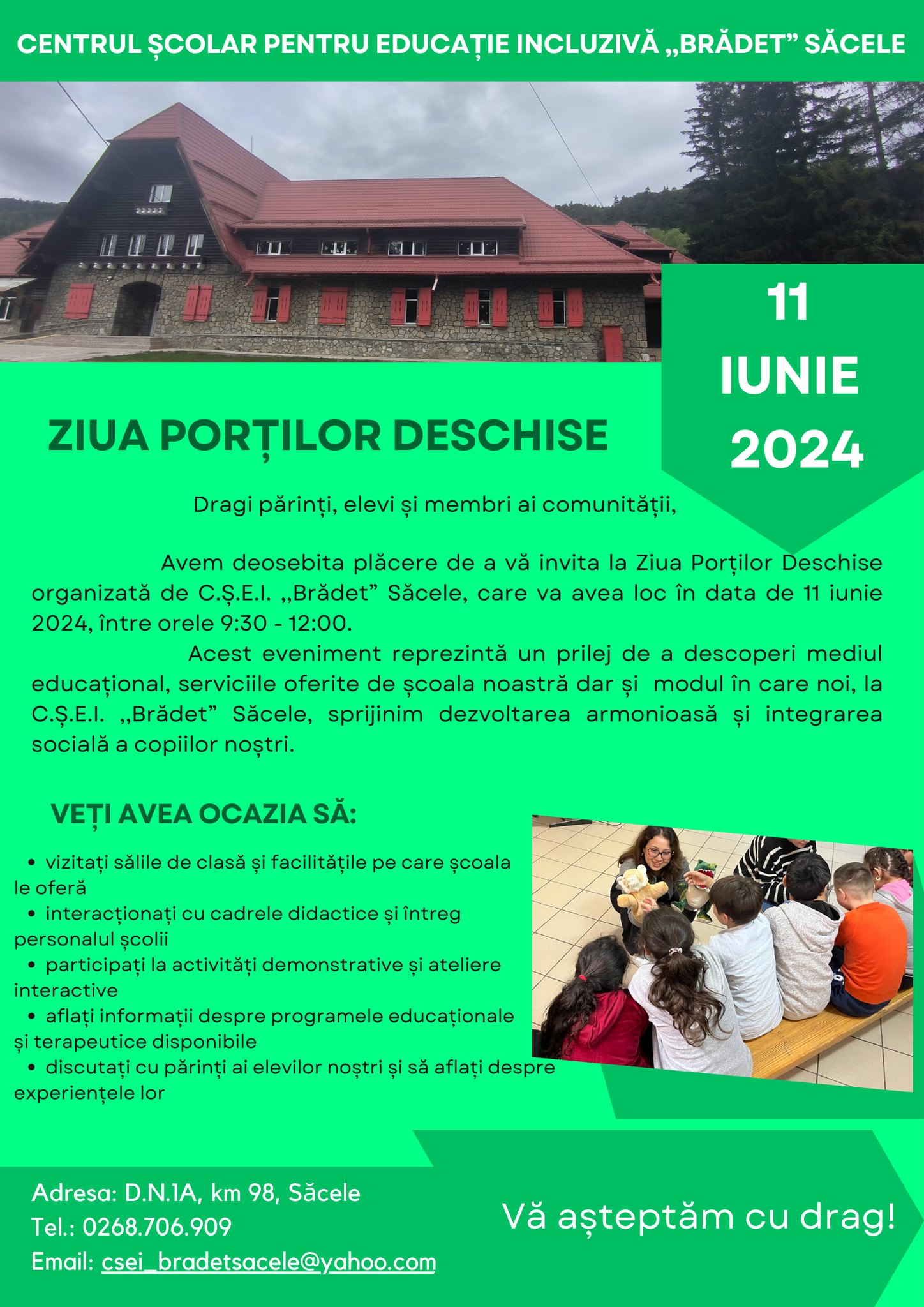 Centrul Şcolar pentru Educaţie Incluzivă „Brădet”, Săcele – instituţie aflată sub autoritatea Consiliului Judeţean Braşov, organizează marţi, 11 iunie 2024, prima ediţie a Zilei Porţilor Deschise.