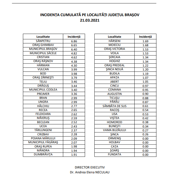 Incidența în localitățile cu cele mai mari probleme din județ este în scădere. La Sânpetru avem o rată de infectare de 6,86 la mia de locuitori, de la 7,16, iar la Ghimbav avem o incidență de 6,65, de la 7,04.
