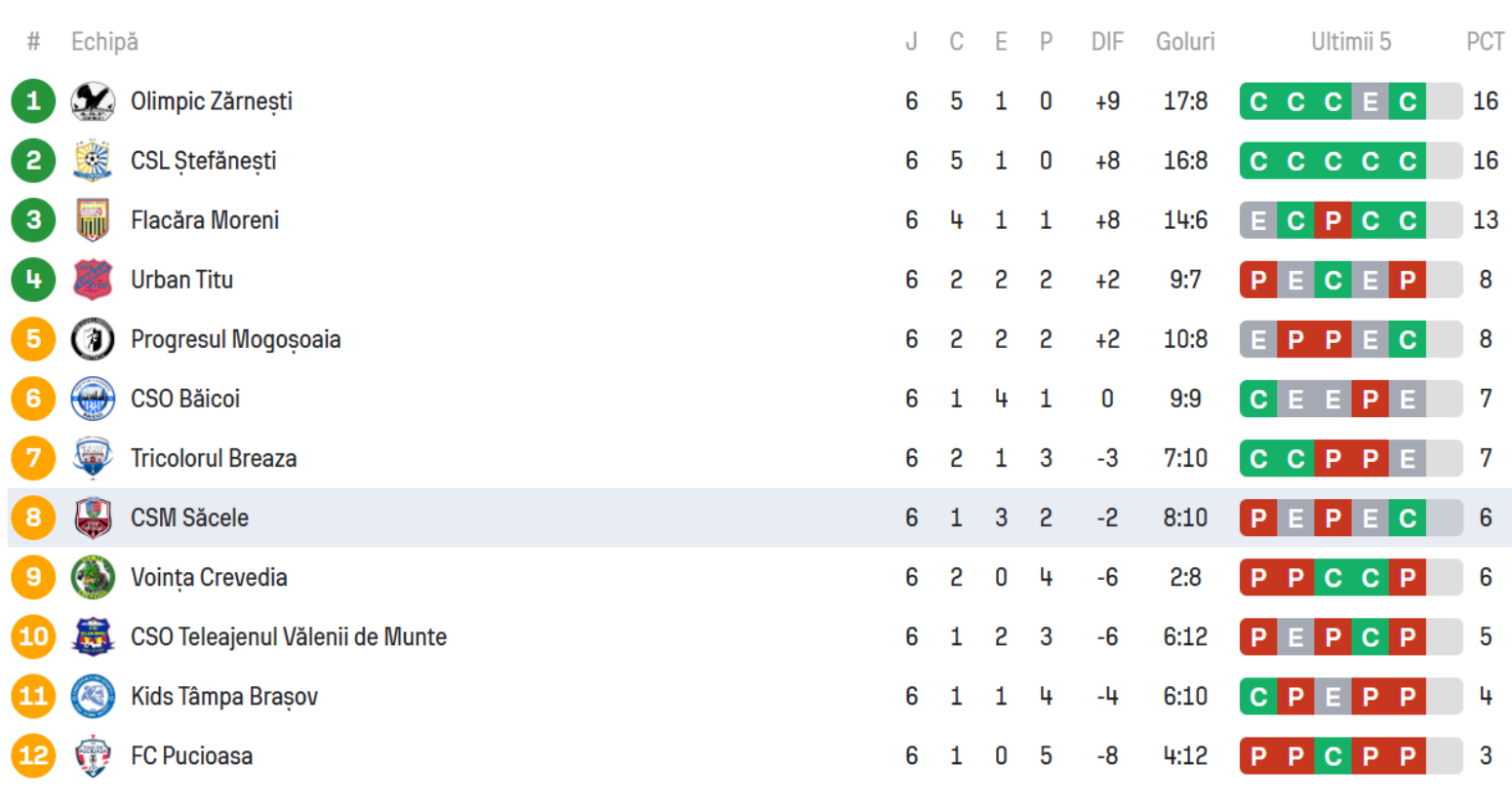 Flacăra Moreni vine sâmbătă la Săcele din postura de ocupantă a locului al treilea în Seria 4 a Ligii a III-a, cu o linie de clasament pozitivă: 4 victorii și un egal în primele 6 partide și un golaveraj de 14-6.