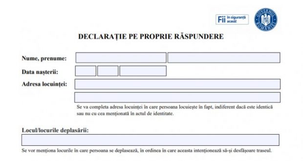 Modelul declarației pe proprie răspundere a fost simplificat în privința datelor care necesită a fi completate, anunță Grupul de Comunicare Strategică, joi, într-un comunicat. Oamenii sunt sfătuiți să nu completeze declarația de pe alte site-uri, pentru că este posibil ca datele personale să le fie furate. Documentul poate fi redactat/completat de pe PC/laptop în câmpurile predefinite, în formatul … Continue reading Declarația pe propria răspundere a fost simplificată – poate fi tipărită sau scrisă de mână – link pentru descărcare în articol
