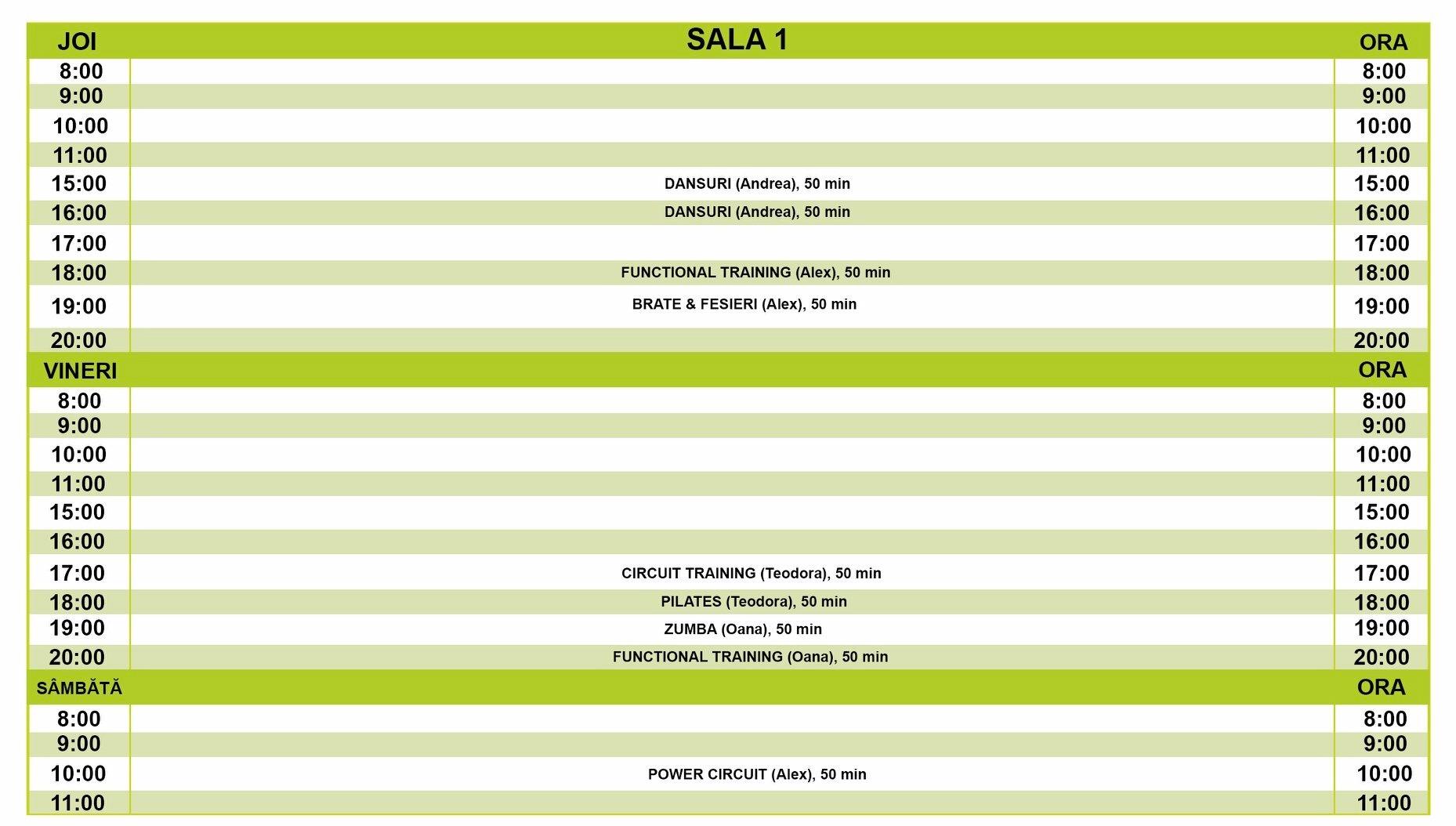 Orarul este gândit în așa mod încât permite o gamă variată de tipuri de antrenamente, de la dansuri sportive și zumba în care persoanele doritoare vor îmbina mișcările specifice dansurilor cu mișcările aerobe.