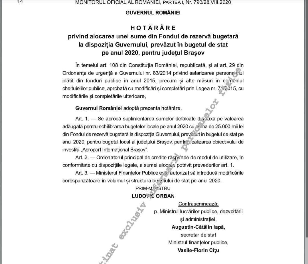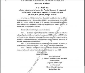 Premierul Ludovic Orban a anunţat joi că Guvernul va aloca încă 25 milioane de lei, din Fondul de rezervă al Executivului, pentru realizarea Aeroportului Internaţional Braşov – Ghimbav.
