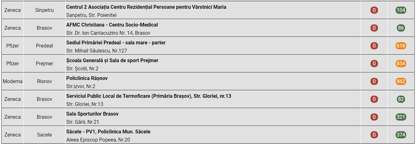 Pentru același tip de vaccin așteaptă multe persoane înscrise în centre precum Brașov, Sânpetru și din nou Codlea.