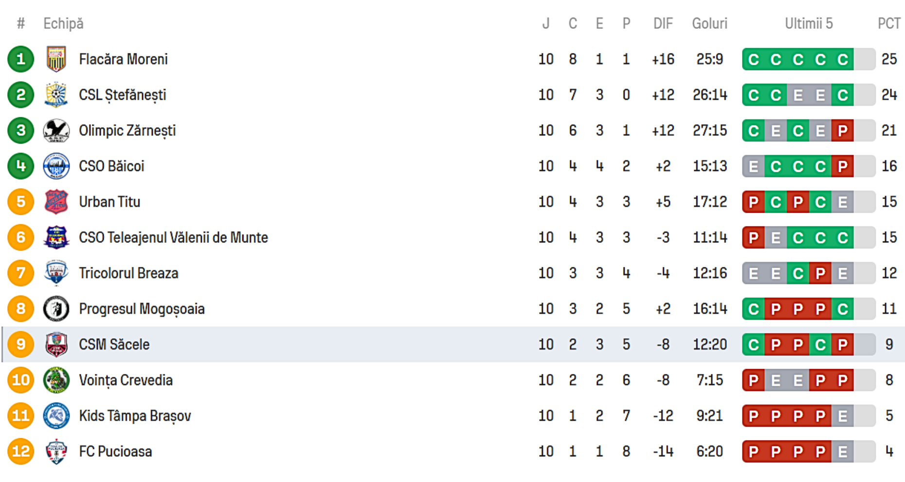 În clasament, CSM Săcele ocupă locul al 9-lea cu 9 puncte acumulate din cele 30 posibile.