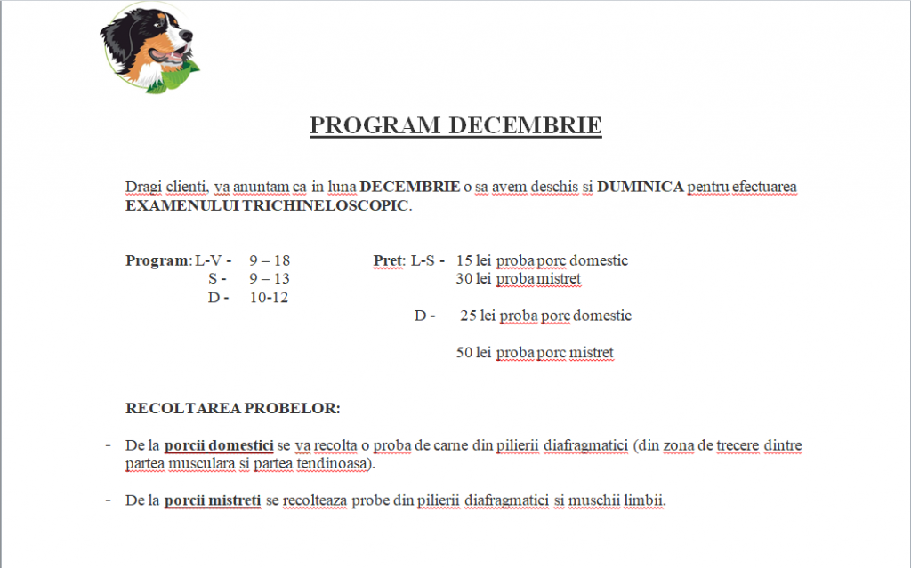 Medicii veterinari de la Betovet ne informează că examenul trichineloscopic al cărnii de porc poate fi efectuat în cabinetul din Cernatu până la sfârşitul lunii decembrie, inclusiv duminica.