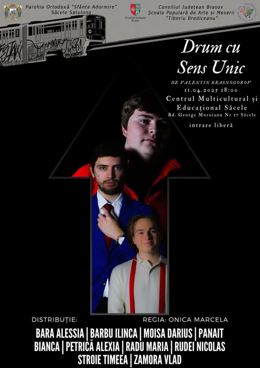 Parohia Ortodoxă Satulung Săcele, în colaborare cu Școala Populară de Arte “Tiberiu Brediceanu” Brașov, vă invită la spectacolul “Drum cu sens unic” de Valentin Krasnogorov.