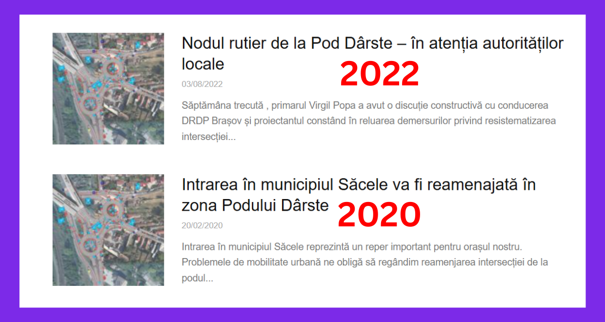 In 2018, 2020 si 2024 in administratia de la Sacele, prin postari, intalniri si activitate de propaganda s-a vorbit despre modernizarea intersectiei Pod-Darste.