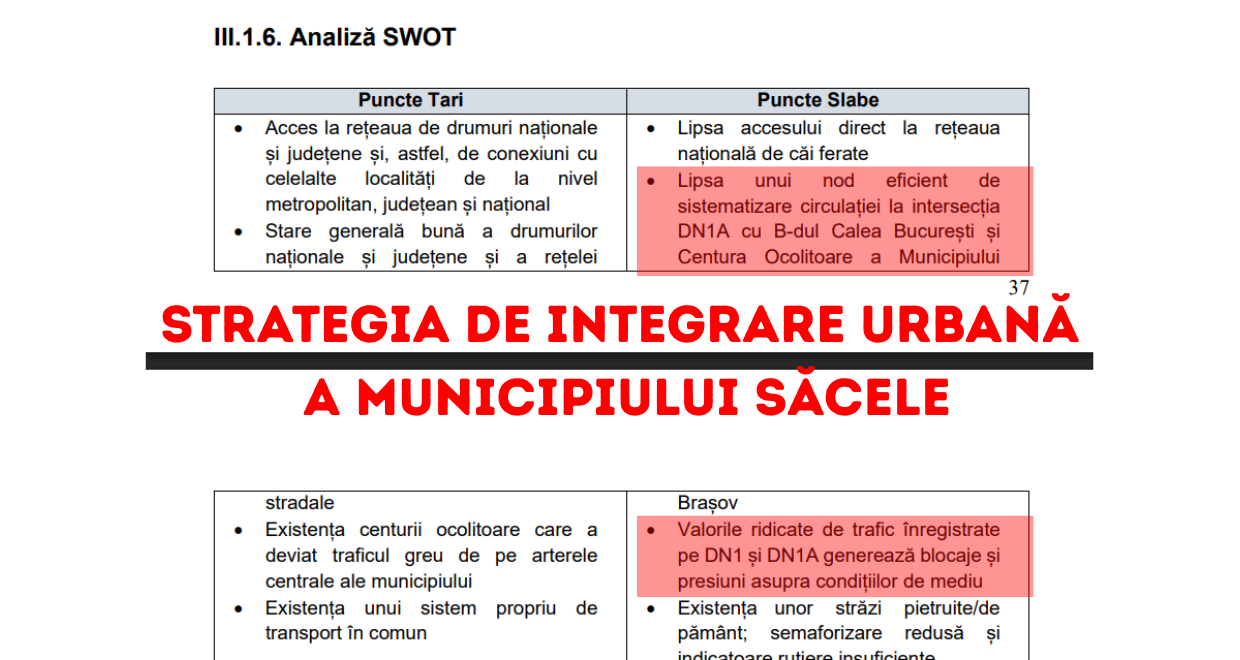 În SIDU 2021 – 2027 (Strategia Integrata de Dezvoltare Urbana a Municipiului Sacele), la capitolul Infrastructura sunt subliniate clar Punctele Slabe: Lipsa unui nod eficient de sistematizare a circulatiei la intersecția DN1A cu B-dul Calea Bucuresti si Centura Ocolitoare a Mun. Brasov si Valorile ridicate de trafic inregistrate pe DN1 si DN1A (strada Campului) care genereaza blocaje si presiuni asupra conditiilor de mediu. (foto jos)
