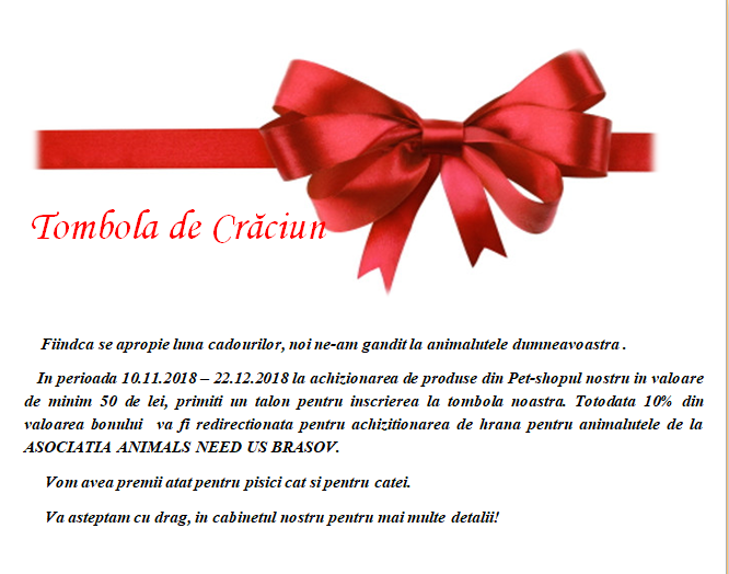 Toți clienții petshop-ului care achiziționează produse în valoare de minim 50 de lei primesc un talon pentru a se înscrie la tombola de Crăciun! Premiile vor fi de două feluri, pentru pisicuțe și pentru cățeluși – alegerea fiind a norocoșilor câștigători!