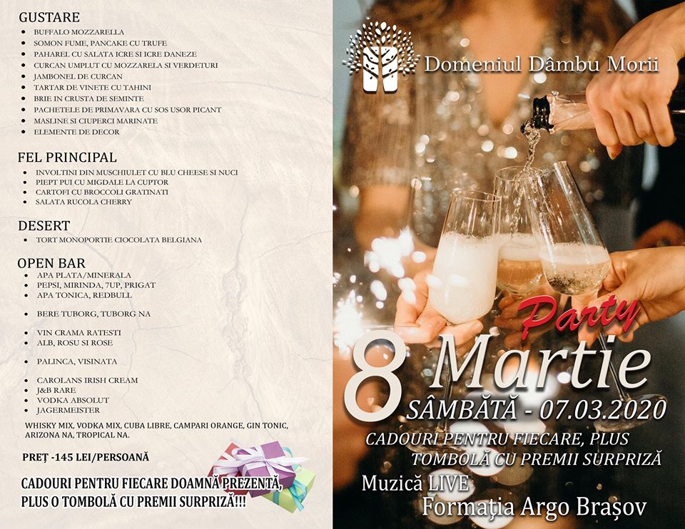 Vă așteptăm cu CADOURI PENTRU FIECARE DOAMNĂ PREZENTĂ, PLUS O TOMBOLĂ CU PREMII SURPRIZĂ, bineînțeles un meniu delicios special conceput pentru dumneavoastră, open bar premium, muzica live cu formația ARGO Brașov.